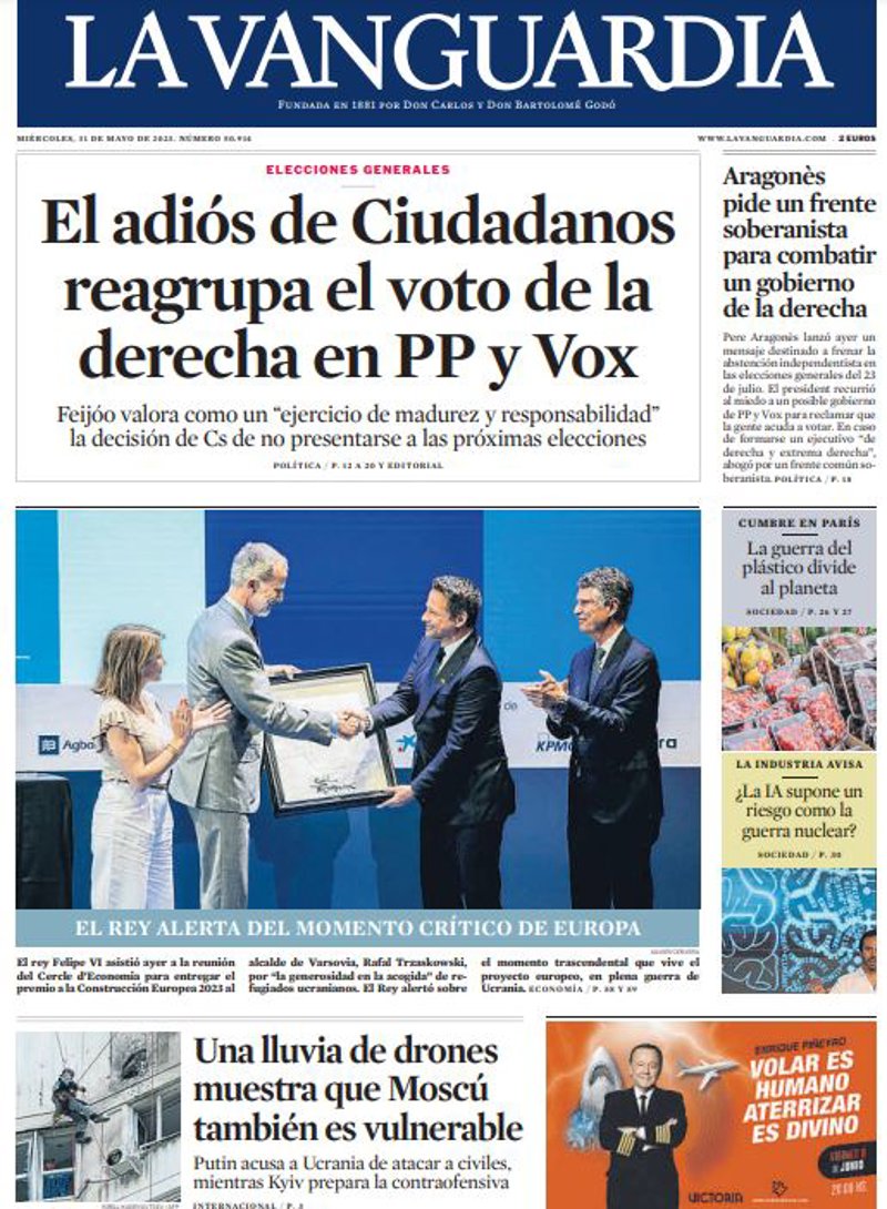 LA VANGUARDIA: "El adiós de Ciudadanos reagrupa el voto de la derecha en PP y Vox"; "Una lluvia de drones muestra que Moscú también es vulnerable"; "Aragonès pide un frente soberanista para combatir un gobierno de la derecha".