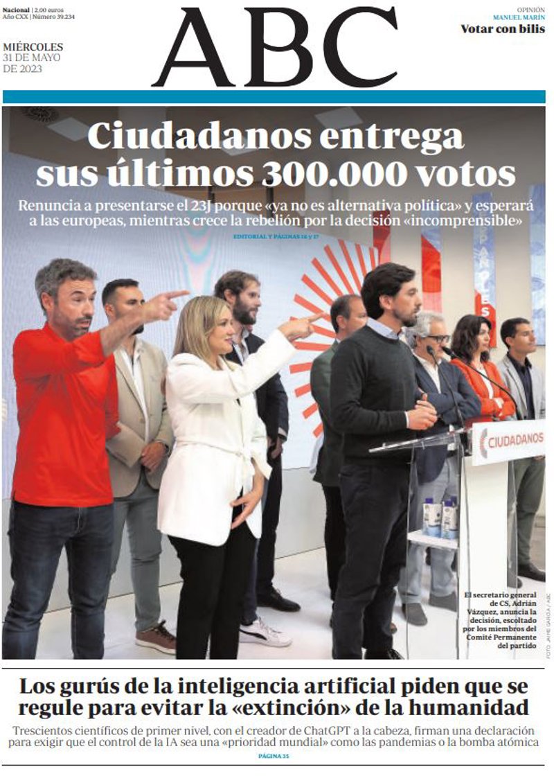 ABC: "Ciudadanos entrega sus últimos 300.000 votos"; "Los gurús de la inteligencia artificial piden que se regule para evitar la "extinción" de la humanidad".