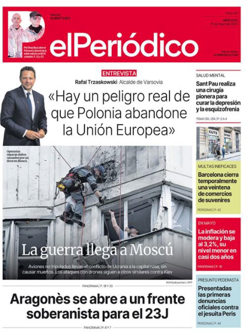 EL PERIÓDICO: "Entrevista Rafal Traskowski, alcalde de Varsovia: "Hay un peligro real de que Polonia abandone la Unión Europea""; "La guerra llega a Moscú"; "Aragonès se abre a un frente soberanista para el 23J"; "Sant Pau realiza una cirugía pionera para curar la depresión y la esquizofrenia"; "Barcelona cierra temporalmente una veintena de comercios de suvenires"; "La inflación se modera y baja al 3,2%, su nivel menos en casi dos años"; "Presentadas las primeras denuncias oficiales contra el jesuita Peris".