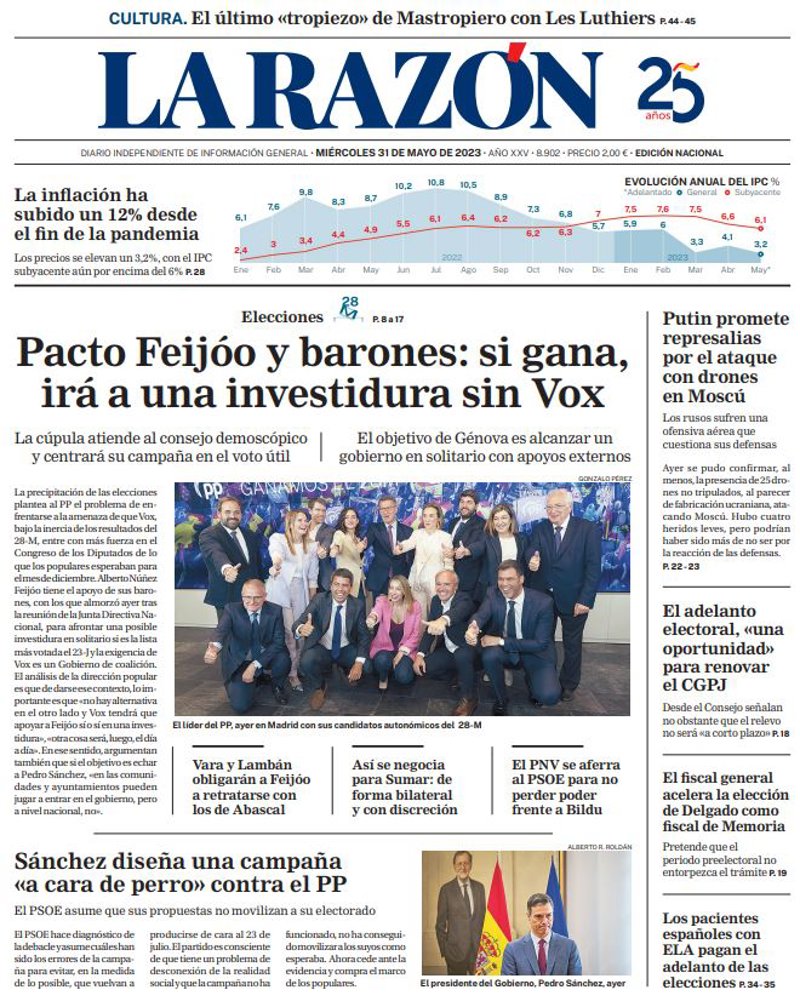 LA RAZÓN: "Pacto Feijóo y barones: si gana, irá a una investidura sin Vox"; "Sánchez diseña una campaña "a cara de perro" contra el PP"; "Putin promete represalias por el ataque con drones en Moscú"; "El adelanto electoral, "una oportunidad" para renovar el CGPJ"; "El fiscal general acelera la elección de Delgado como fiscal de Memoria"; "Los pacientes españoles con ELA pagan el adelanto de las elecciones".