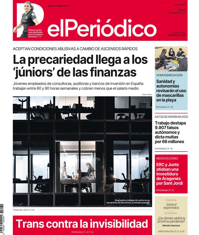 EL PERIÓDICO: "La precariedad llega a los 'júniors' de las finanzas"; "Trans contra la invisibilidad"; "Sanidad y autonomías revisarán el uso de mascarillas en la playa"; "Trabajo destapa 9.907 falsos autónomos y dicta multas por 66 millones"; "ERC y Junts atisban una investidura de Aragonès por Sant Jordi".