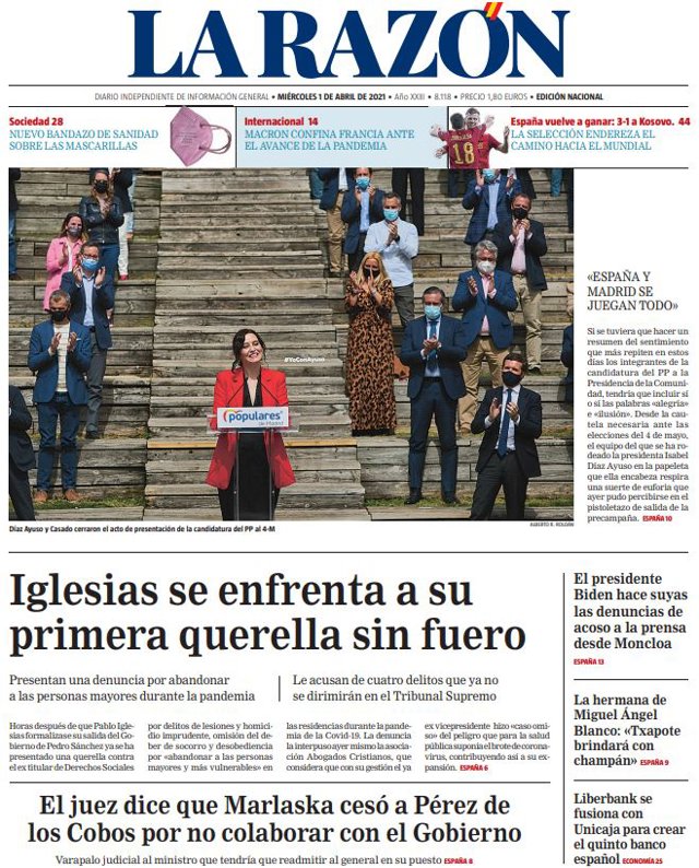 LA RAZÓN: "Iglesias se enfrenta a su primera querella sin fuero"; "El juez dice que Marlaska cesó a Pérez de los Cobos por no colaborar con el Gobierno"; "El presidente Biden hace suyas las denuncias de acoso a la prensa desde Moncloa"; "La hermana de Miguel Ángel Blanco: "Txapote brindará con champán""; "Liberbank se fusiona con Unicaja para crear el quinto banco español".