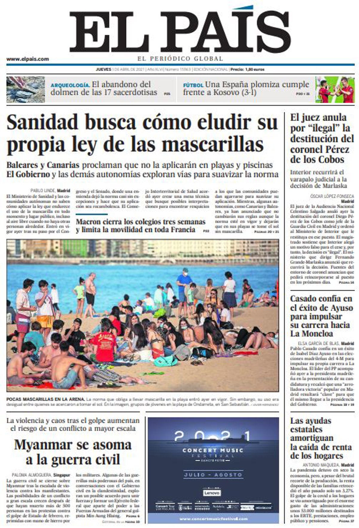 EL PAÍS: "Sanidad busca cómo eludir su propia ley de las mascarillas. Baleares y Canarias proclaman que no la aplicarán en playas y piscinas. El Gobierno y las demás autonomías exploran vías para suavizar la norma"; "Macron cierra los colegios tres semanas y limita la movilidad en toda Francia"; "Myanmar se asoma a la guerra civil. La violencia y caos tras el golpe aumentan el riesgo de un conflicto a mayor escala"; "El juez anula por "ilegal" la destitución del coronel Pérez de los Cobos. Interior recurrirá el varapalo judicial a la decisión de Marlaska"; "Casado confía en el éxito de Ayuso para impulsar su carrera hacia La Moncloa"; "Las ayudas estatales amortiguan la caída de renta de los hogares".