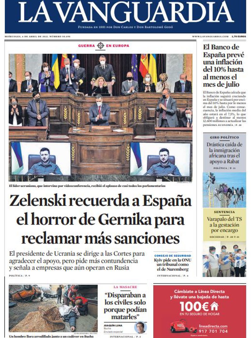 LA VANGUARDIA: "Zelenski recuerda a España el horror de Gernika para reclamar más sanciones"; ""Disparaban a los civiles solo porque podían matarles""; "El Banco de España prevé una inflación del 10% hasta al menos el mes de julio".