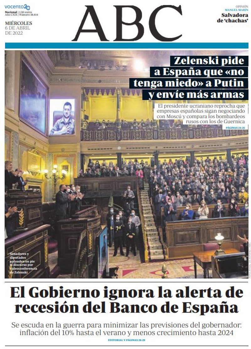 ABC: "Zelenski pide a España que "no tenga miedo" a Putin y envíe más armas. El presidente ucraniano reprocha que empresas españolas sigan negociando con Moscú y compara los bombardeos rusos con los de Guernica"; "El Gobierno ignora la alerta de recesión del Banco de España. Se escuda en la guerra para minimizar las previsiones del gobernador: inflación del 10% hasta el verano y menos crecimiento hasta 2024".