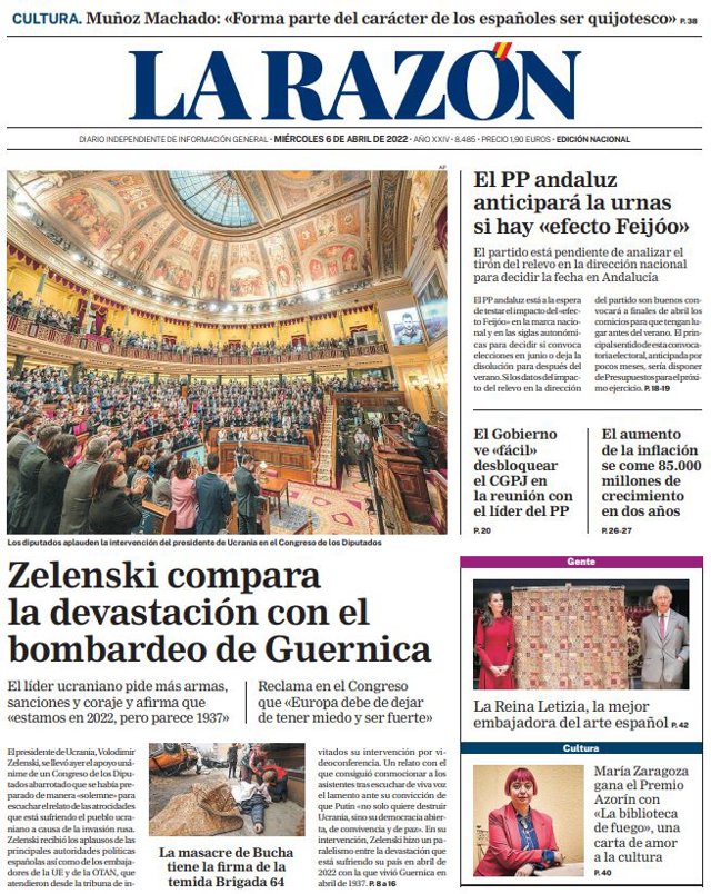 LA RAZÓN: "Zelenski compara la devastación con el bombardeo de Guernica"; "La masacre de Bucha tiene la firma de la temida Brigada 64"; "El PP andaluz anticipará la urnas si hay "efecto Feijóo""; "El Gobierno ve "fácil" desbloquear el CGPJ en la reunión con el líder del PP"; "El aumento de la inflación se come 85.000 millones de crecimiento en dos años".