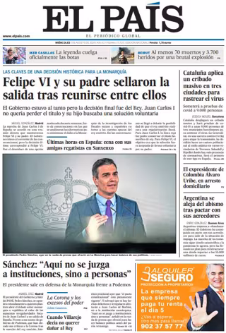 EL PERIÓDICO: "Sánchez se compromete en defensa de la Corona"; "El padre del Rey se mantiene en paradero oculto"; "Decenas de muertos en Beirut por dos fuertes explosiones"; "El empleo crece con 161.217 nuevos afiliados, la mayor alza en 15 años"; "El Gobierno elude dar detalles de su papel en la marcha al extranjero del rey emérito"; "Libertad de movimiento para el exjefe del Estado si no hay causa penal"; "Pilar Eyre: "El anterior monarca no creer haber hecho nada malo".