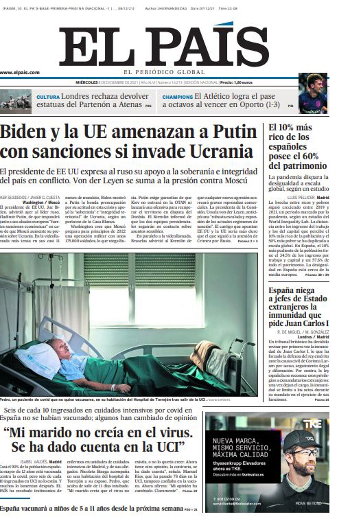 EL PAÍS: "Biden y la UE amenazan a Putin con sanciones si invade Ucrania"; ""Mi marido no creía en el virus. Se ha dado cuenta en la UCI""; "El 10% más rico de los españoles posee el 60% del patrimonio"; "España niega a jefes de Estado extranjeros la inmunidad que pide Juan Carlos I".