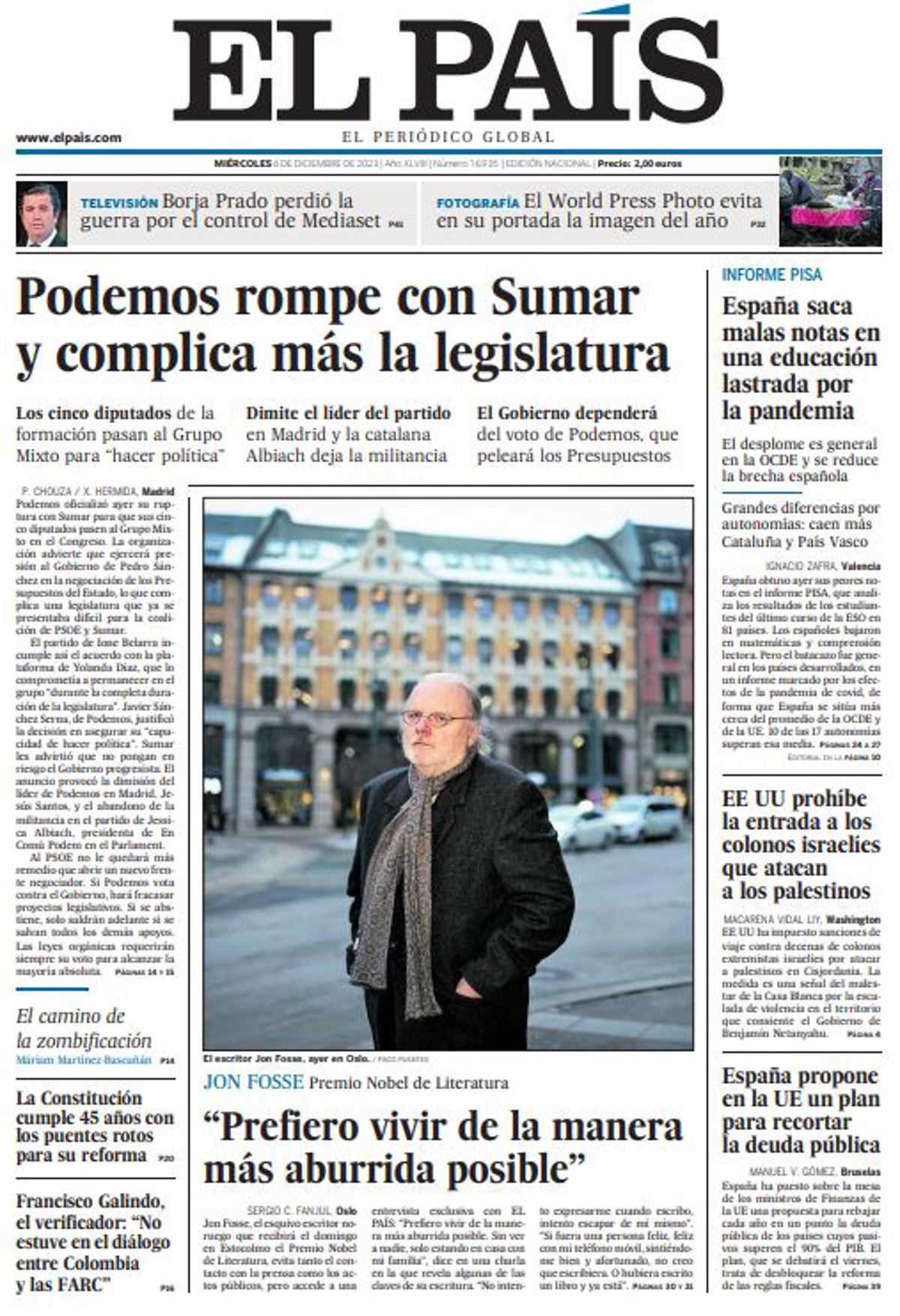 EL PAÍS: "Podemos rompe con Sumar y complica más la legislatura"; "Jon Fosse, premio Nobel de Literatura: "Prefiero vivir de la manera más aburrida posible""; "La Constitución cumple 45 años con los puentes rotos para su reforma"; "Francisco Galindo, el verificador: "No estuve en el diálogo entre Colombia y las FARC""; "España saca malas notas en una educación lastrada por la pandemia"; "EE UU prohíbe la entrada a los colonos israelíes que atacan a los palestinos"; "España propone en la UE un plan para recortar la deuda pública".