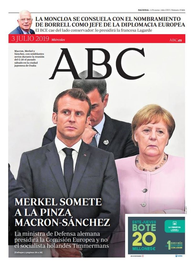 ABC: "Merkel somete a la pinza Macron-Sánchez"; "La ministra de Defensa alemana presidirá la Comisión Europea y no el socialista holandés Timmermans"; "La Moncloa se consuela con el nombramiento de Borrell como jefe de la diplomacia europea"; "El BCE cae del lado conservador: lo presidirá la francesa Lagarde".
