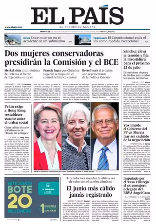 EL PAÍS: "Dos mujeres conservadoras presidirán la Comisión y el BCE"; "Sánchez eleva la tensión y fija la investidura para el próximo 22 de julio"; "Pekín exige a Hong Kong restablecer cuanto antes el orden social"; "Vox impide el Gobierno del PP en Murcia tras ser excluido de la negociación"; "Imputado por el 'caso Villarejo' el ex consejero delegado del BBVA Ángel Cano"; "El junio más cálido jamás registrado".