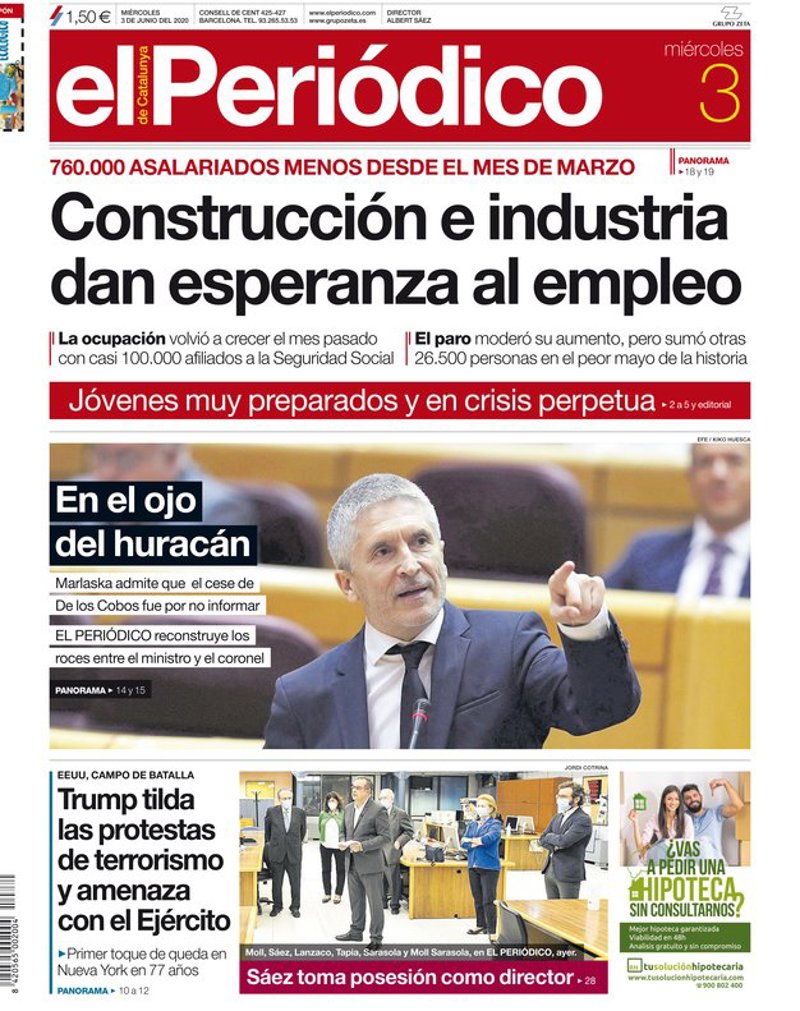 EL PERIÓDICO: "Construcción e industria dan esperanza al empleo"; "Jóvenes muy preparados y en crisis perpetua"; "En el ojo del huracán. Marlaska admite que el cese de De Los Cobos fue por no informar. 'El Periódico' reconstruye los roces entre el ministro y el corones"; "Trump tilda las protestas de terrorismo y amenaza con el Ejército".