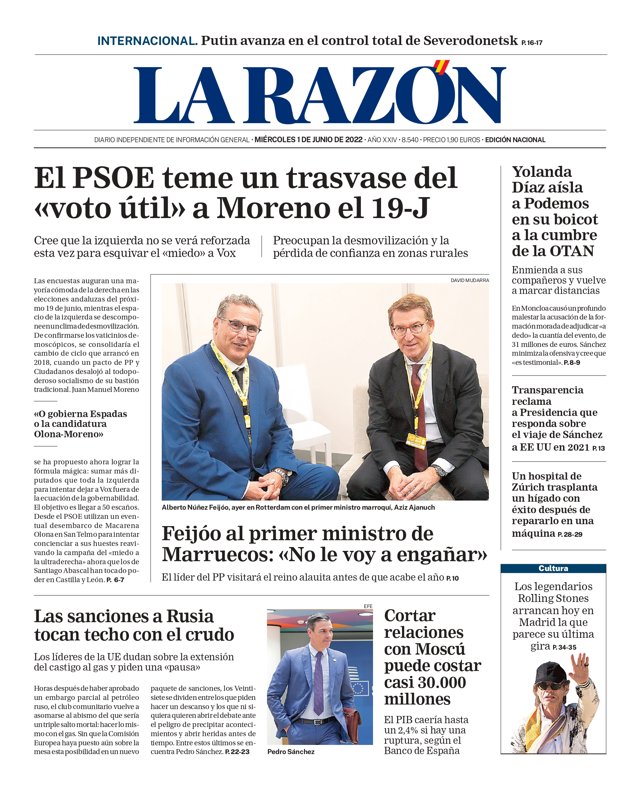 LA RAZÓN: "El PSOE teme un trasvase del voto útil a Moreno el 19-J"; "Feijóo al primer ministro de Marruecos: 'No le voy a engañar'"; "Yolanda Díaz aísla a Podemos en su boicot a la cumbre de la OTAN"; "Transparencia reclama a Presidencia que responda sobre el viaje de Sánchez a EEUU en 2021"; "Un hospital de Zúrich trasplanta un hígado con éxito después de repararlo en una máquina"; "Cortar relaciones con Moscú puede costar casi 30.000 millones"; "Las sanciones a Rusia tocan techo con el crudo"; "Los legendarios Rolling Stones arrancan hoy en Madrid la que parece su última gira".