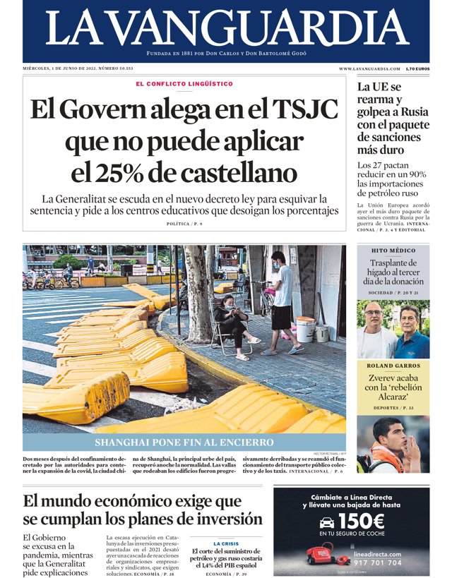 LA VANGUARDIA: "El Govern alega en el TSJC que no puede aplicar el 25% de castellano"; "El mundo económico exige que se cumplan los planes de inversión"; "La UE se rearma y golpea a Rusia con el paquete de sanciones más duro"; "Trasplante de hígado al tercer día de la donación"; "Zverev acaba con la 'rebelión' Alcaraz".
