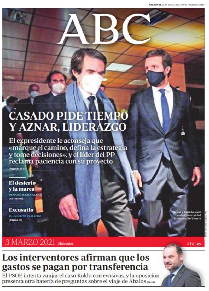 ABC: "Casado pide tiempo y Aznar, liderazgo. El expresidente le aconseja que "marque el camino, defina la estrategia y tome decisiones", y el líder del PP reclama paciencia con su proyecto"; "Los interventores afirman que los gastos se pagan por transferencia. El PSOE intenta zanjar el caso Koldo con evasivas, y la oposición presenta otra batería de preguntas sobre el viaje de Ábalos".