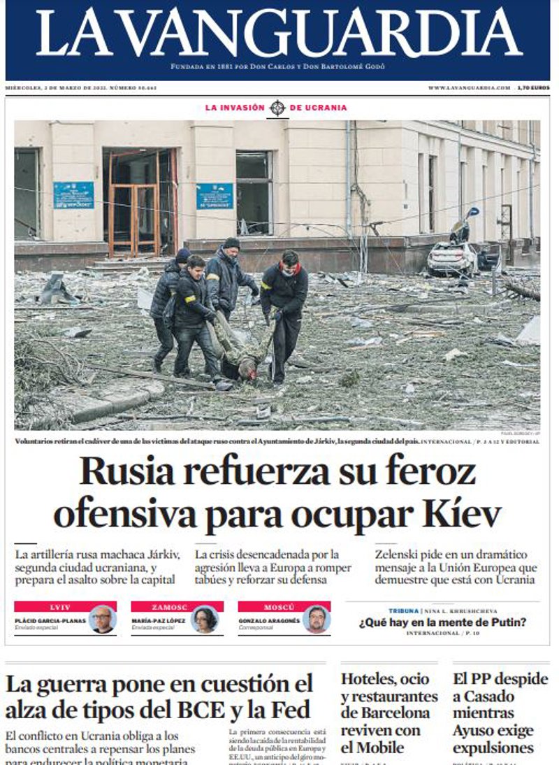 LA VANGUARDIA: "Rusia refuerza su feroz ofensiva para ocupar Kíev"; "La guerra pone en cuestión el alza de tipos del BCE y la Fed"; "Hoteles, ocio y restaurantes de Barcelona reviven con el Mobile"; "El PP despide a Casado mientras Ayuso exige expulsiones".