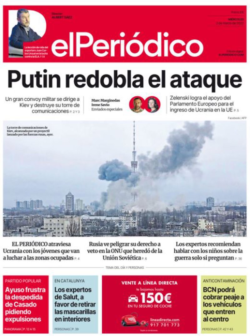 EL PERIÓDICO: "Putin redobla el ataque"; "Ayuso frustra la despedida de Casado pidiendo expulsiones"; "Los expertos de Salut, a favor de retirar las mascarillas en interiores"; "BCN podrá cobrar peaje a los vehículos que entren al centro".