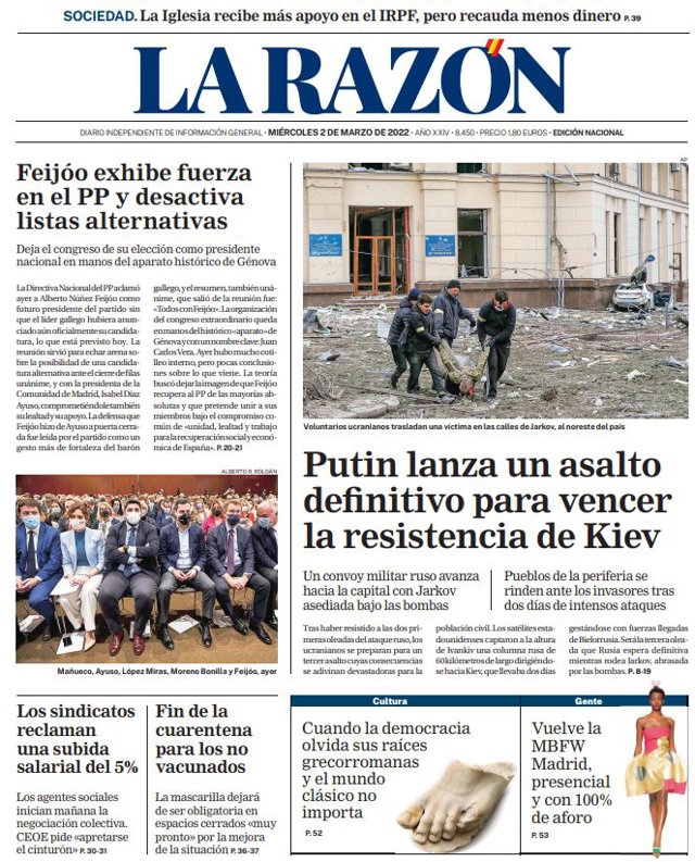 LA RAZÓN: "Feijóo exhibe fuerza en el PP y desactiva listas alternativas. Deja el congreso de su elección como presidente nacional en manos del aparato histórico de Génova"; "Putin lanza un asalto definitivo para vencer la resistencia de Kiev"; "Los sindicatos reclaman una subida salarial del 5%"; "Fin de la cuarentena para los no vacunados".