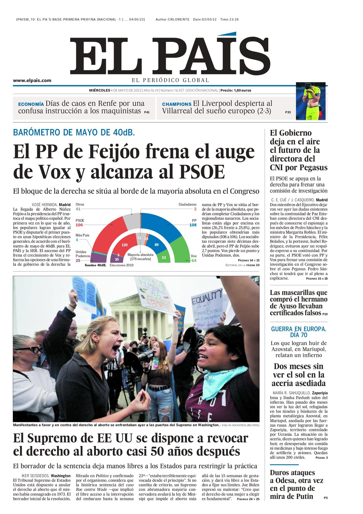 EL PAÍS: "El PP de Feijóo frena el auge de Vox y alcanza al PSOE"; "El Supremo de EEUU se dispone a revocar el derecho al aborto casi 50 años después"; "El Gobierno deja en el aire el futuro de la directora del CNI por Pegasus"; "Las mascarillas que compró el hermano de Ayuso llevaban certificados falsos"; "Dos meses sin ver el sol en la acería asediada"; "Duros ataques a Odesa, otra vez en el punto de mira de Putin".