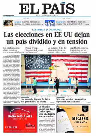 EL PAÍS: "Las elecciones en EE UU dejan un país dividido y en tensión. Una campaña discreta de Biden, otra personalista de Trump. Seis retos sociales y económicos esperan en la Casa Blanca"; "La Fiscalía investiga a Juan Carlos I por usar una tarjeta a otro nombre".