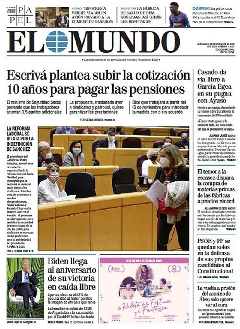 EL MUNDO: "Escrivá plantea subir la cotización 10 años para pagar las pensiones"; "Biden llega al aniversario de su victoria en caída libre"; "Casado da vía libre a García Egea en su pugna con Ayuso"; "El temor a la escasez dispara la compra de materias primas de las fábricas a precios récord"; "PSOE y PP se quedan solos en la defensa de sus propios candidatos al Constitucional"; "La vuelta a prisión del asesino de Álex: solo quiere ver al cura".