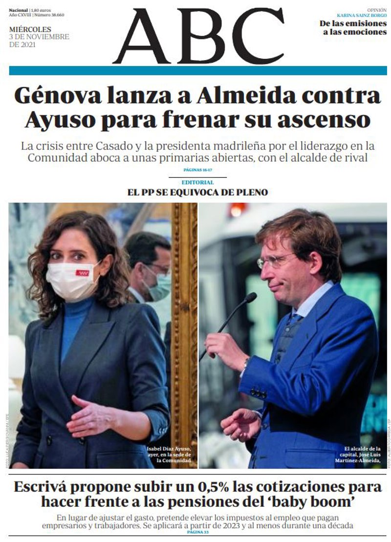 ABC: "Génova lanza a Almeida contra Ayuso para frenar su ascenso. La crisis entre Casado y la presidenta madrileña por el liderazgo en la Comunidad aboca a unas primarias abiertas, con el alcalde de rival"; "Escrivá propone subir un 0,5% las cotizaciones para hacer frente a las pensiones del 'baby boom'. En lugar de ajustar el gasto, pretende elevar los impuestos al empleo que pagan empresarios y trabajadores. Se aplicará a partir de 2023 y al menos durante una década".