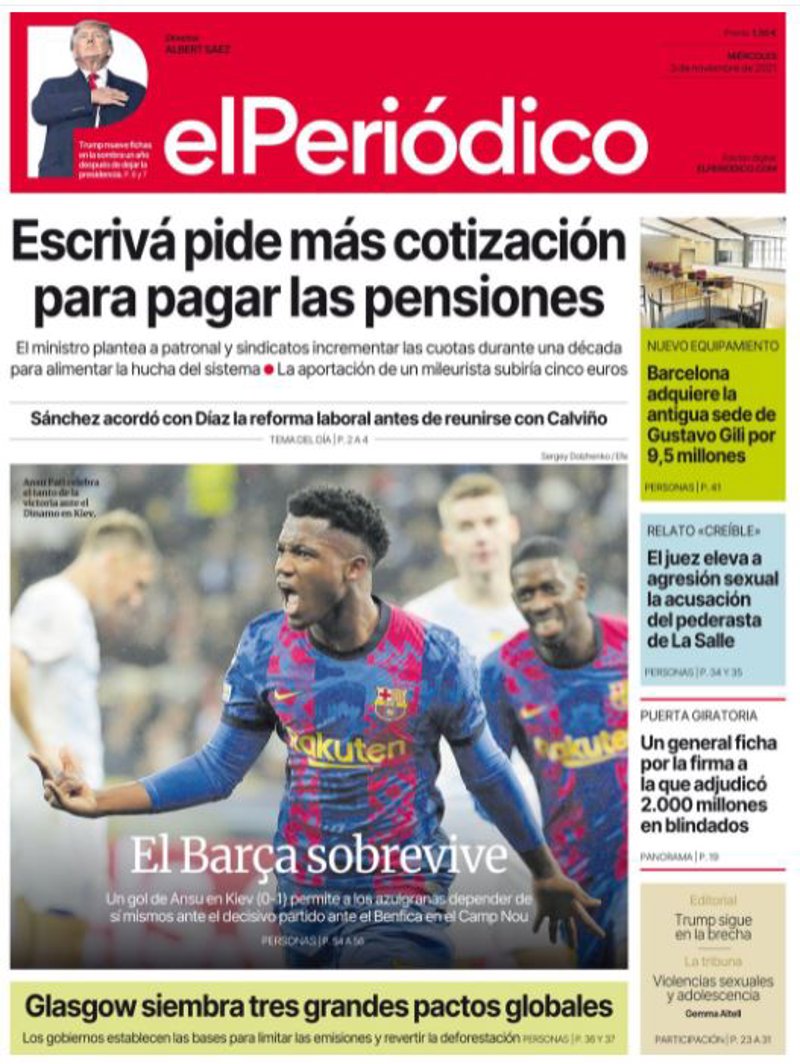 EL PERIÓDICO: "Escrivá pide más cotización para pagar las pensiones"; "El Barça sobrevive"; "Glasgow siembre tres grandes pactos globales"; "Barcelona adquiere la antigua sede de Gustavo Gill por 9,5 millones"; "El juez eleva a agresión sexual la acusación del pederasta de La Salle"; "Un general ficha por la firma que adjudicó 2.000 millones en blindados".