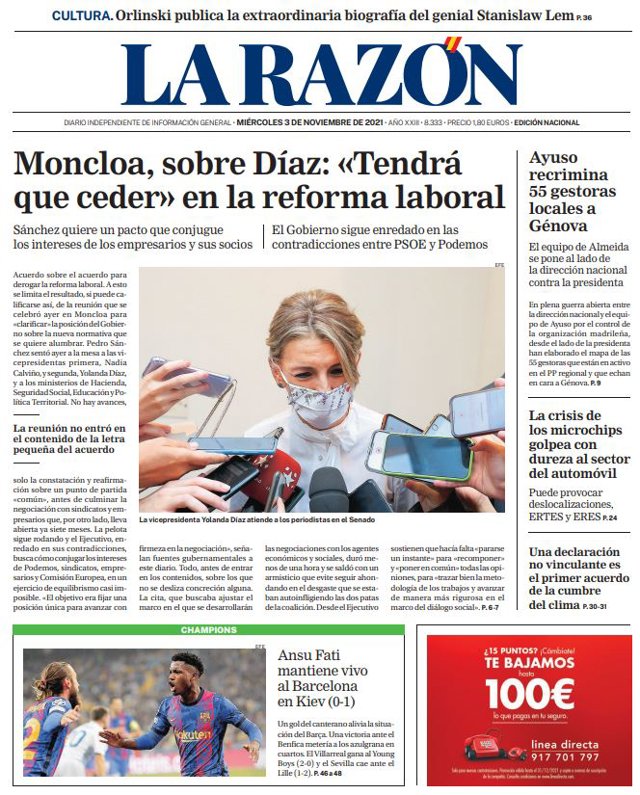 LA RAZÓN: "Moncloa, sobre Díaz: "Tendrá que ceder" en la reforma laboral"; "Ayuso recrimina 55 gestoras locales a Génova"; "La crisis de los microchips golpea con dureza al sector del automóvil"; "Una declaración no vinculante es el primer acuerdo de la cumbre del clima".