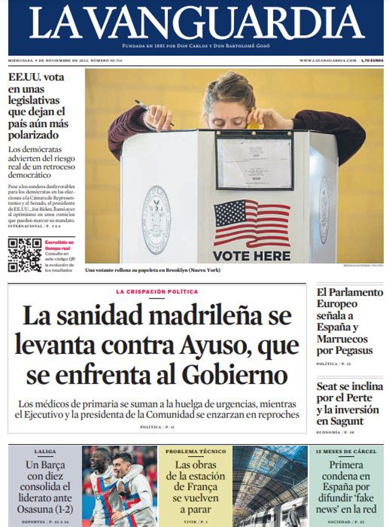 LA VANGUARDIA: "La sanidad madrileña se levanta contra Ayuso, que se enfrenta al Gobierno"; "El Parlamento Europeo señala a España y Marruecos por Pegasus"; "Seat se inclina por el Perte y la inversión en Sagunt"; "EE.UU. vota en unas legislativas que dejan el país aún más polarizado".