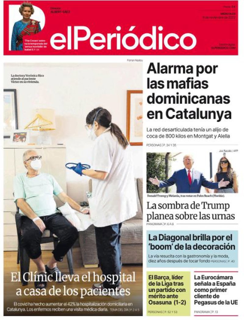 EL PERIÓDICO: "El Clínic lleva el hospital a casa de los pacientes"; "Alarma por las mafias dominicanas en Catalunya"; "La sombra de Trump planea sobre las urnas"; "La Diagonal brilla por el 'boom' de la decoración"; "El Barça, líder de la Liga tras un partido con mérito ante Osasuna"; "La Eurocámara señala a España como primer cliente de Pegasus de la UE".