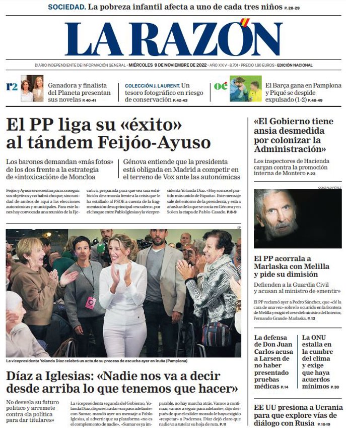 LA RAZÓN: "El PP liga su "éxito" al tándem Feijóo-Ayuso"; "Díaz a Iglesias: "Nadie nos va a decir desde arriba lo que tenemos que hacer""; ""El Gobierno tiene ansia desmedida por colonizar la Administración""; "El PP acorrala a Marlaska con Melilla y pide su dimisión"; "La defensa de Don Juan Carlos acusa a Larsen de no haber presentado pruebas médica"; "La ONU estalla en la cumbre del clima y exige que haya acuerdos mínimos"; "EE UU presiona a Ucrania para que explore vías de diálogo con Rusia".
