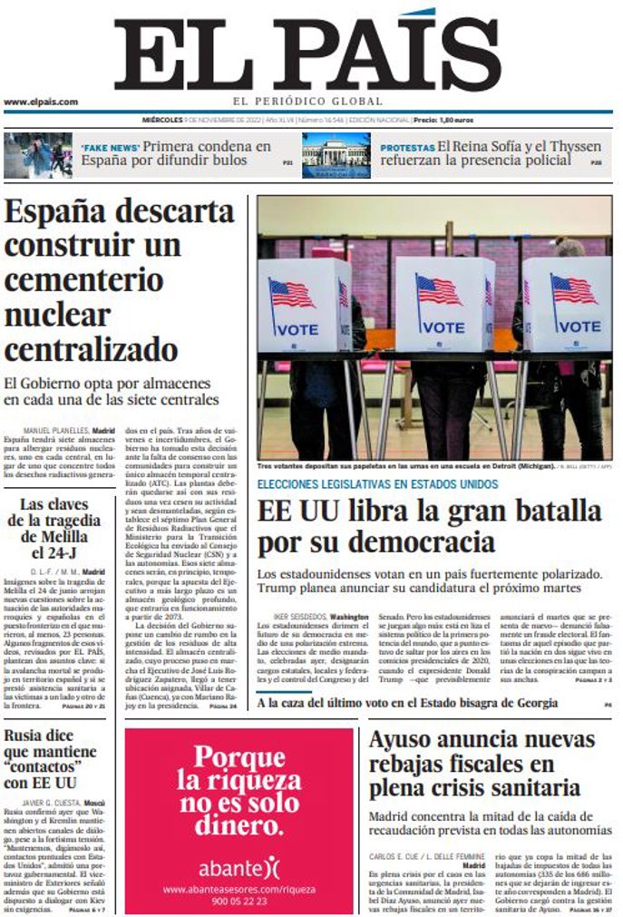 EL PAÍS: "España descarta construir un cementerio nuclear centralizado"; "EE UU libra la gran batalla por su democracia"; "Las claves de la tragedia de Melilla el 24-J"; "Rusia dice que mantiene "contactos" con EE UU"; "Ayuso anuncia nuevas rebajas fiscales en