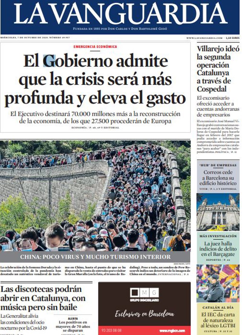 LA VANGUARDIA: "El Gobierno admite que la crisis será más profunda y eleva el gasto"; "Las discotecas podrán abrir en Catalunya, con música pero sin baile"; "Villarejo ideó la segunda operación Catalunya a través de Cospedal".