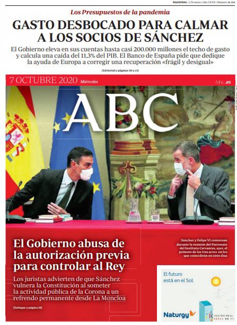 ABC: "Gasto desbocado para calmar a los socios de Sánchez. El Gobierno eleva en sus cuentas hasta casi 200.000 millones el techo de gasto y calcula una caída del 11,3% del PIB. El Banco de España pide que dedique la ayuda de Europa a corregir una recuperación "frágil y desigual""; "El Gobierno abusa de la autorización previa para controlar al Rey. Los juristas advierten de que Sánchez vulnera la Constitución al someter la actividad pública de la Corona a un refrendo permanente desde La Moncloa".