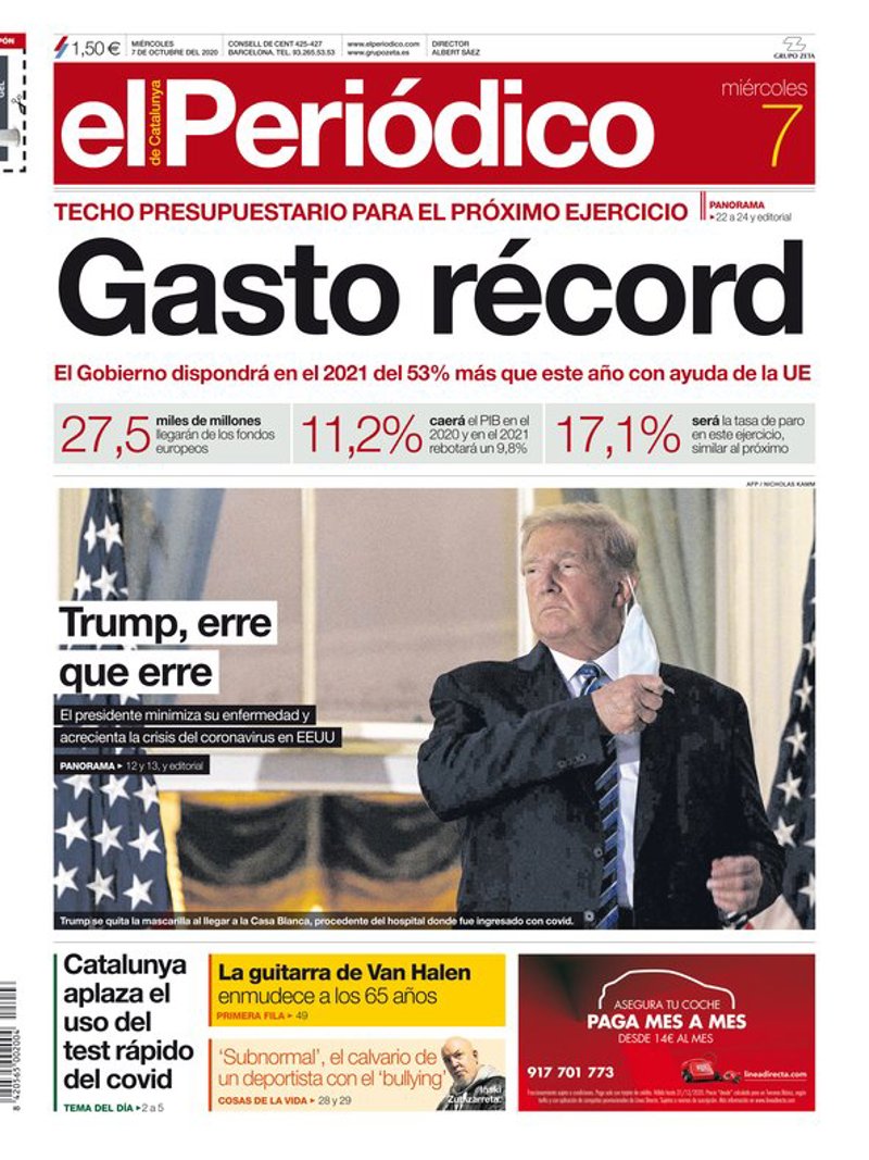 EL PERIÓDICO: "Gasto récord"; "Trump, erre que erre. El presidente minimiza su enfermedad y acrecienta la crisis del coronavirus en EEUU"; "Catalunya aplaza el uso del test rápido del covid"; "La guitarra de Van Halen enmudece a los 65 años"; "'Subnormal', el calvario de un deportista con el 'bullying'".
