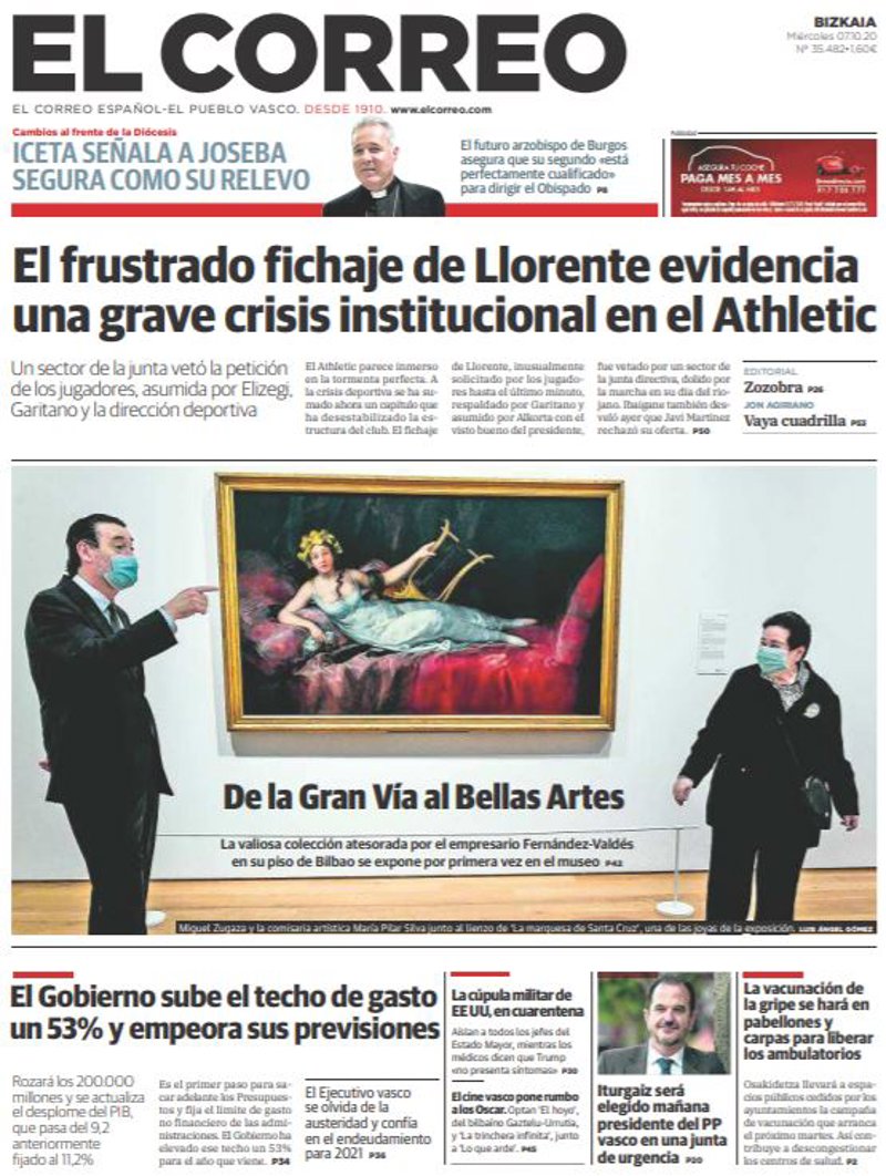 EL CORREO: "El frustrado fichaje de Llorente evidencia una grave crisis institucional en el Athletic"; "El Gobierno sube el techo de gasto un 53% y empeora sus previsiones"; "La cúpula militar de EE UU, en cuarentena"; "El cine vasco pone rumbo a los Oscar"; "Iturgaiz será elegido mañana presidente del PP vasco en una junta de urgencia"; "La vacunación de la gripe se hará en pabellones y carpas para liberar los ambulatorios".