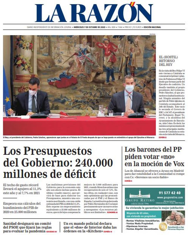 LA RAZÓN: "Los Presupuestos del Gobierno: 240.000 millones de déficit"; "Sanidad designará un comité del PSOE que fijará las reglas para evaluar la pandemia"; "Un ex mando policial declara que el "dos" de Interior daba las órdenes en la "Kitchen""; "Los barones del PP piden votar "no" en la moción de Vox".
