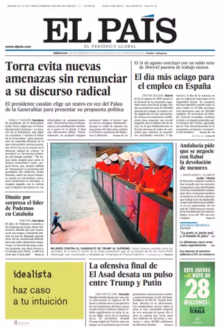 EL PAÍS: "Torra evita nuevas amenazas sin renunciar a su discurso radical"; "El día más aciago para el empleo en España"; "Dimite por sorpresa el líder de Podemos en Cataluña"; "Andalucía pide que se negocie con Rabat la devolución de menores"; "La ofensiva final de El Asad desata un pulso entre Trump y Putin".