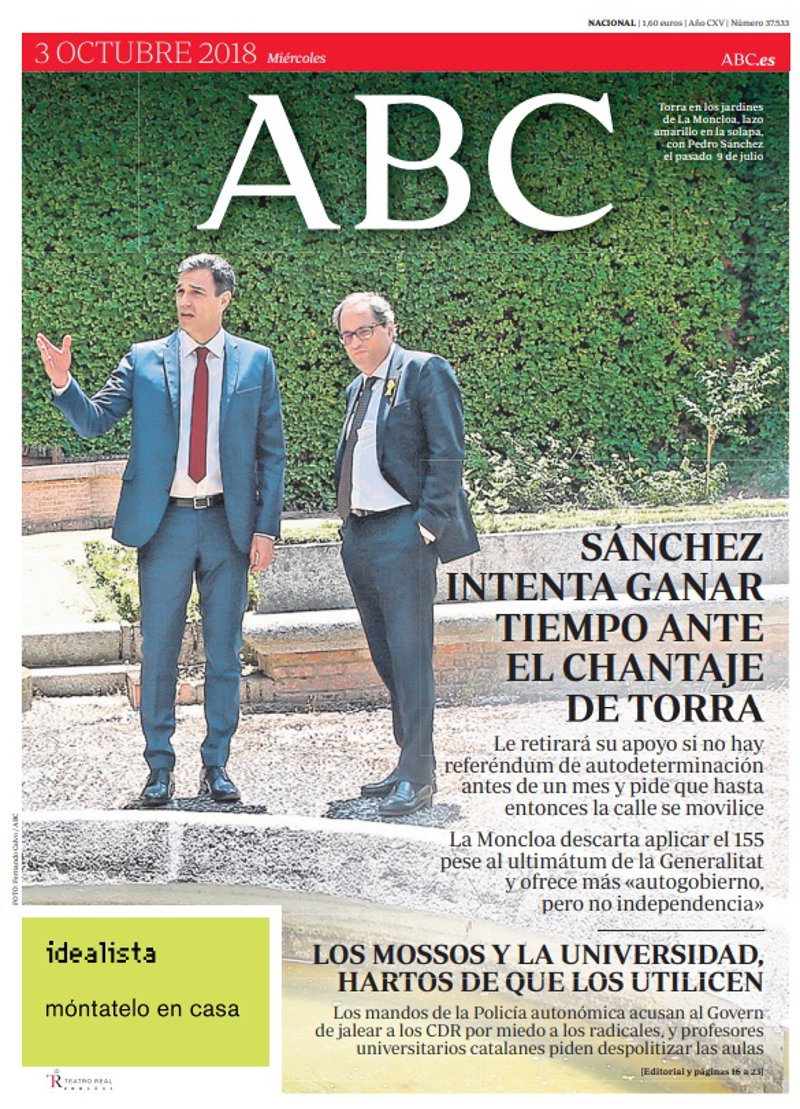 ABC: "Sánchez intenta ganar tiempo ante el chantaje de Torra"; "Le retirará su apoyo si no hay referéndum de autodeterminación antes de un mes y pide que hasta entonces la calle se movilice"; "La Moncloa descarta aplicar el 155 pese al ultimátum de la Generalitat y ofrece más "autogobierno, pero no independencia".