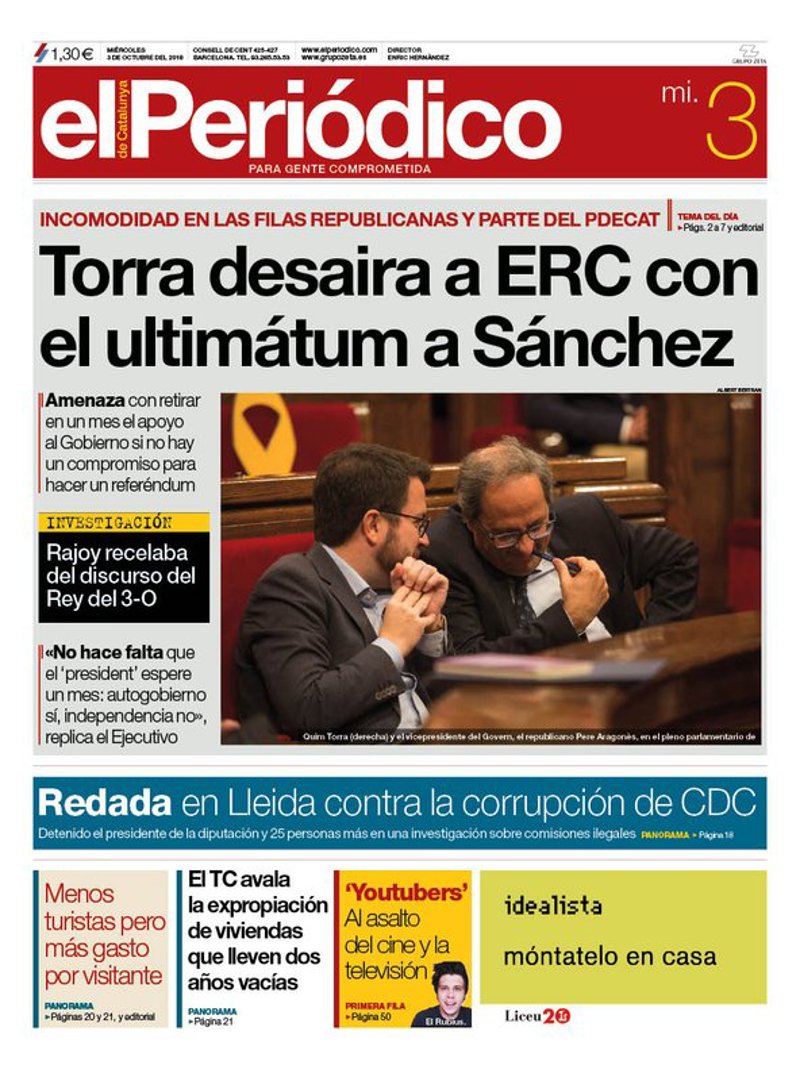 EL PERIÓDICO: "Torra desaira a ERC con el ultimátum a Sánchez"; "Rajoy recelaba del discurso del Rey del 3-0"; "Redada en Lleida contra la corrupción de CDC"; "Menos turistas pero más gasto por visitante"; "El TC avala la expropiación de viviendas que lleven dos años vacías".