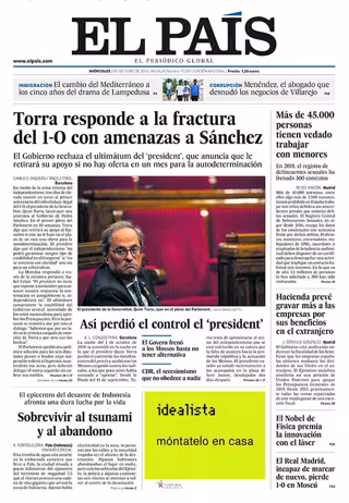 EL PAÍS: "Torra responde a la fractura del 1-0 con amenazas a Sánchez"; "Así perdió el control el 'president'. El Govern frenó a los Mossos hasta no tener alternativa. CDR, el secesionismo que no obedece a nadie"; "Sobrevivir al tsunami y al abandono. El epicentro del desastre de Indonesia afronta una dura lucha por la vida"; "Más de 45.000 personas tienen vedado trabajar con menores"; "Hacienda prevé gravar más a las empresas por sus beneficios en el extranjero"; "El Nobel de Física premia la innovación con el láser"; "El Real Madrid, incapaz de marcar de nuevo, pierde 1-0 en Moscú".