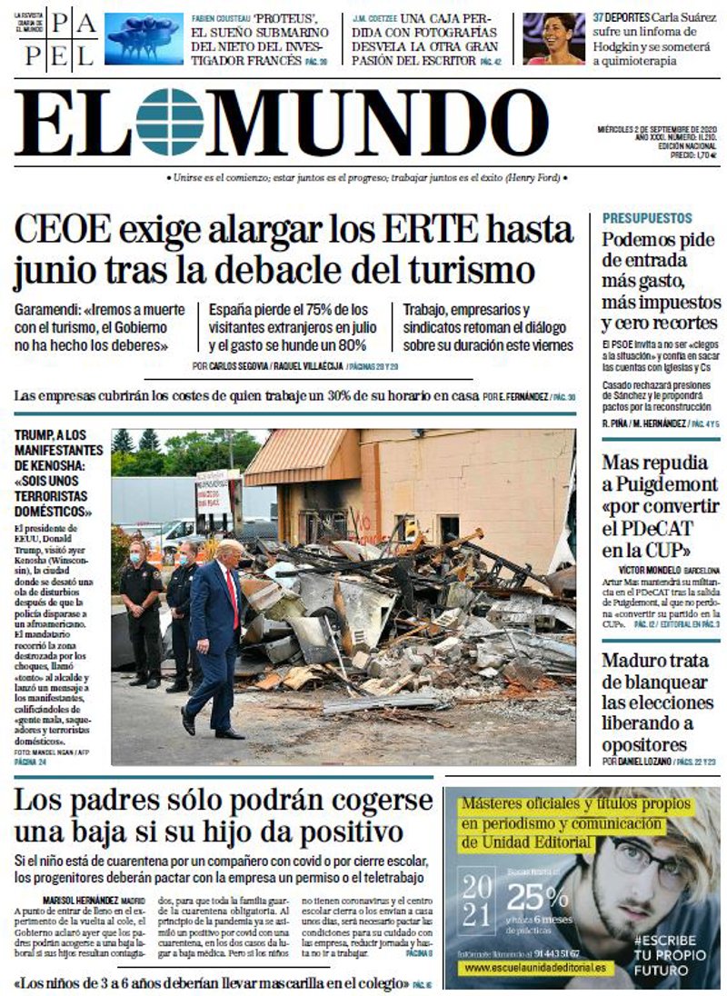 EL MUNDO: "CEOE exige alargar los ERTE hasta junio tras la debacle del turismo"; "Los padres sólo podrán cogerse una baja si su hijo da positivo"; "Podemos pide de entrada más gasto, más impuestos y cero recortes"; "Mas repudia a Puigdemont "por convertir el PDeCAT en la CUP""; "Maduro trata de blanquear las elecciones liberando a opositores"; "Trump, a los manifestantes de Kenosha: "Sois unos terroristas domésticos"".