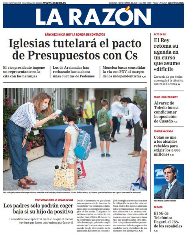 LA RAZÓN: "Iglesias tutelará el pacto de Presupuestos con Cs"; "Los padres solo podrán coger baja si su hijo da positivo"; "El Rey retoma su agenda en un curso que asume "difícil""; "Álvarez de Toledo busca condicionar la oposición de Casado"; "Colau se une a los alcaldes rebeldes para exigir los 5.000 millones"; "El 5G de Telefónica llegará al 75% de los españoles".