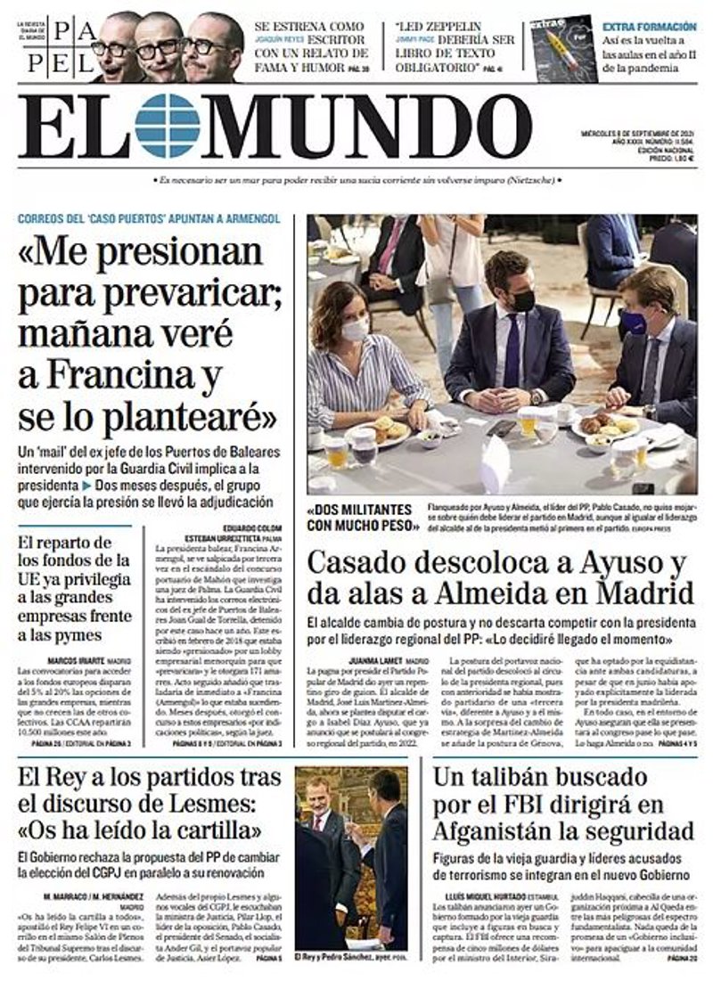 EL MUNDO: ""Me presionan para prevaricar; mañana verá a Francina y se lo plantearé"; "El reparto de los fondos de la UE ya privilegia a las grandes empresas frente a las pymes"; "El Rey a los partidos tras el discurso de Lesmes: "Os ha leído la cartilla""; "Casado descoloca a Ayuso y da alas a Almeida en Madrid"; "Un talibán buscado por el FBI dirigirá en Afganistán la seguridad".