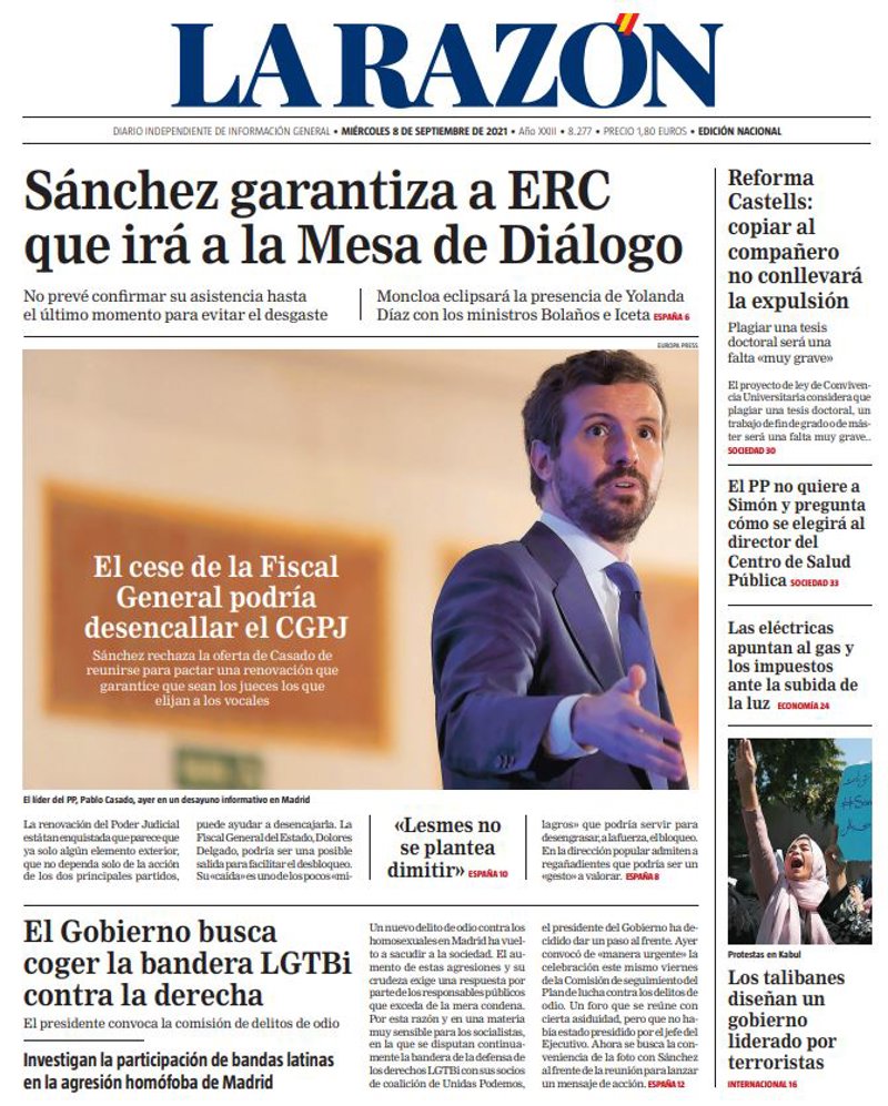 LA RAZÓN: "Sánchez garantiza a ERC que irá a la Mesa de Diálogo"; "El Gobierno busca coger la bandera LGTBi contra la derecha"; "Investigan la participación de bandas latinas en la agresión homófoba de Madrid"; "El cese de la Fiscal General podría desencallar el CGPJ"; "Reforma Castells: copiar al compañero no conllevará la expulsión"; "El PP no quiere a Simón y pregunta cómo se elegirá al director del Centro de Salud Pública"; "Las eléctricas apuntan al gas y los impuestos ante la subida de la luz"; "Los talibanes diseñan un gobierno liderado por terroristas".