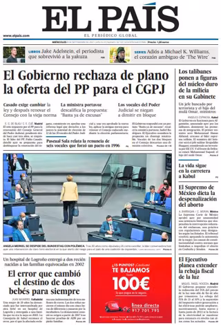 EL PAÍS: "El Gobierno rechaza de plano a oferta del PP para el CGPJ"; "El error que cambió el destino de dos bebés para siempre"; "Los talibanes ponen a figuras del núcleo duro de la milicia en su Gabinete"; "La vida sigue en la carretera a Kabul"; "El Supremo de México dicta la despenalización del aborto"; "El Ejecutivo planea extender la rebaja fiscal de la luz".