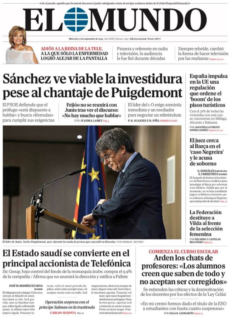 EL MUNDO: "Sánchez ve viable la investidura pese al chantaje de Puigdemont"; "El Estado saudí se convierte en el principal accionista de Telefónica": "España impulsa en la UE una regulación que ordene el 'boom' de los pisos turísticos"; "El juez cerca al Barça en el 'caso Negreira' y le acusa de soborno"; "La Federación destituye a Vilda al frente de la selección femenina"; "Arden los chats de profesores: "Los alumnos creen que saben todo y no aceptan ser corregidos"".