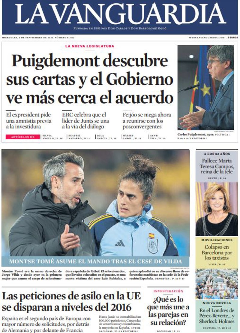 LA VANGUARDIA: "Puigdemont descubre sus cartas y el Gobierno ve más cerca el acuerdo"; "Las peticiones de asilo en la UE se disparan a niveles del 2016"; "¿Qué es lo que más une a las parejas en su relación?".