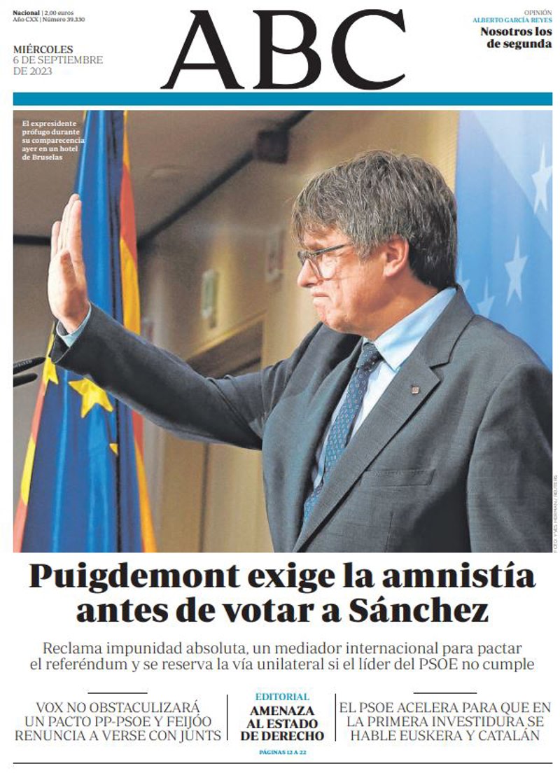 ABC: "Puigdemont exige la amnistía antes de votar a Sánchez. Reclama impunidad absoluta, un mediador internacional para pactar el referéndum y se reserva la vía unilateral si el líder del PSOE no cumple".