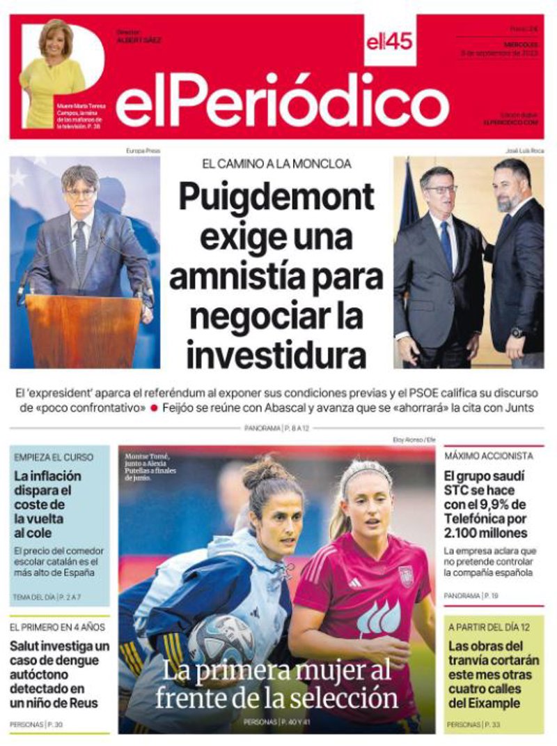EL PERIÓDICO: "Puigdemont exige una amnistía para negociar la investidura"; "La inflación dispara el coste de la vuelta al cole"; "Salut investiga un caso de dengue autóctono detectado en un niño de Reus"; "El grupo saudí STC se hace con el 9,9% de Telefónica por 2.100 millones"; "Las obras del tranvía cortarán este mes otras cuatro calles del Eixample"; "La primera mujer al frente de la selección".